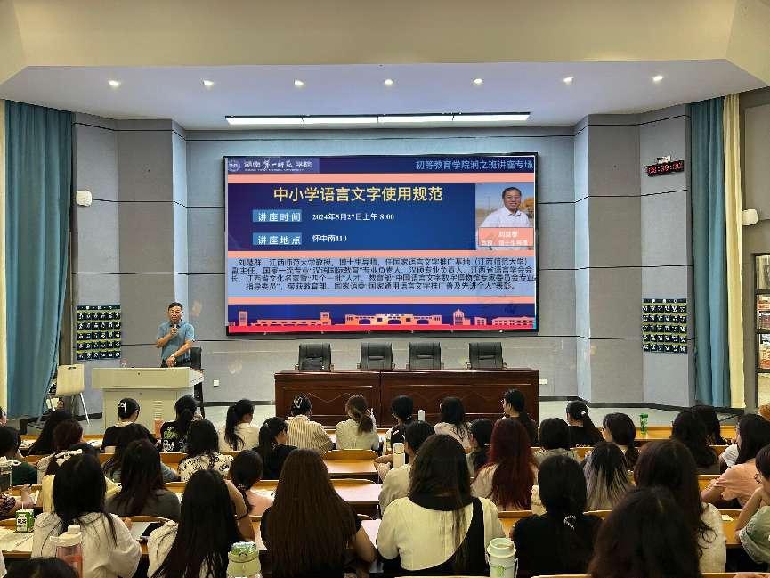 刘楚群教授讲座的题目是“中小学语言文字使用规范”。他以中小学教材为例,深入分析了教材语言表达的失范问题,重点阐述了教材语言表达的示范和教材语言的最高境界。讲座结合了师范生的未来职业特点,具有很强的针对性和启示性。