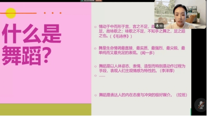 11月2日上午,首都师范大学舞蹈教育博士研究生何晓迪应邀为伟德bv1946官网师生开展题为“走进舞蹈与创意舞动”的线上讲座。伟德bv1946官网艺体教育系全体教师及23级小教专业、6年制初招音乐专业的100余人参与本次讲座。讲座由艺体教育系系主任易文颖副教授主持。