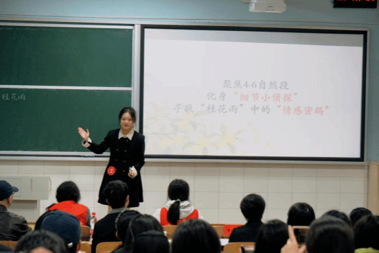 小学文科组2号选手张雅澜带来的《桂花雨》一课脱颖而出,展现了扎实的教学功底与创新的课堂理念,赢得评委与观众的一致好评。她以“借物抒情”为教学核心,以“寻找情感密码”为主线任务,运用对比导入、初读探究、小组合作等多元环节,层层深入引导学生体会桂花所蕴含的思乡之情。课堂中,她设计了“摇桂花”小剧场任务,让学生在情景演绎中感受童真与亲情;通过“‘浸’字品析”等细节探究,引导学生体悟文字背后的情感张力,巧妙地突破教学重难点。整堂课兼顾朗读感悟、文本分析与实践体验,作业设计注重基础巩固与生活拓展,充分体现了“以生为本”的教学理念。张雅澜凭借清晰的教学逻辑与丰富的课堂互动,将抒情散文教学转化为一堂生动有趣的语文课,彰显了未来教师的专业素养与教学魅力。