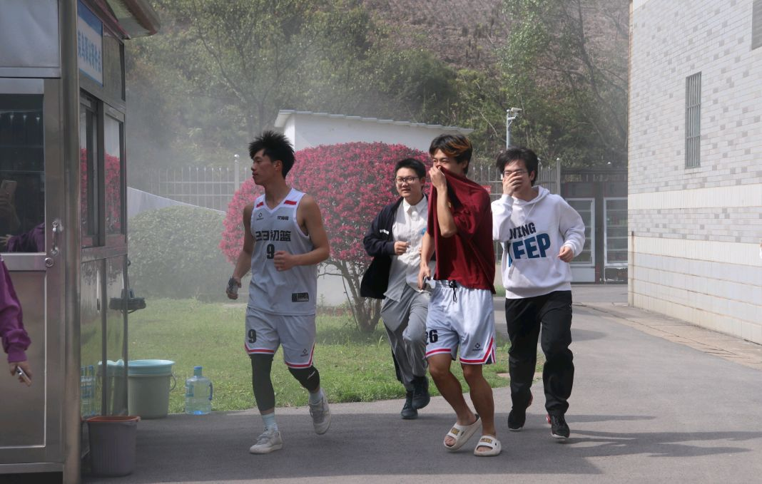 演练开始前,周洋教官对参与演练的师生进行详细的消防安全知识培训。随着演练信号发出,火灾逃生模拟在学生宿舍楼内迅速展开。烟饼释放出大量烟雾,楼道内浓烟滚滚,营造出逼真的火灾氛围。面对突如其来的“火情”,师生们迅速反应,按照周洋教官指导,有序进行疏散。同学们用湿毛巾捂住口鼻,低头弯腰,沿着指定的疏散路线迅速撤离宿舍楼。辅导员们则负责引导和维护秩序,确保每个学生都能安全撤离。
