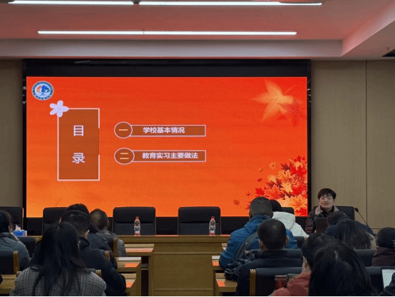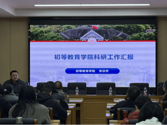 会前,博才红枫小学副校长黄敏受邀作专题报告。黄敏介绍了博才红枫小学的基本情况及承担师范生教育实习指导工作的经验做法。她提到,博才红枫小学是 2024 年 9 月启航的湘江新区博才小学教育集团公办成员校,办学一年半来始终得到湖南第一师范学院的支持,衷心感谢学院持续输送优秀实习生。学校秉持 “真善美慧” 校训,构建了 “枫采三航” 实习课程体系。“青枫启航” 阶段通过建立服务管理圈与贴身导师圈、明确三方目标及 “导师五个一”“实习生五个一” 要求筑牢基础;“橙枫续航” 阶段以摸底子、打样子、照模子、登台子的阶梯式培育推进实践,并通过树立榜样、展开多元评价等方式保障质量;“红枫远航” 阶段依托多样活动、多元研训及富有仪式感的结业李汉学全面通报了学院科研工作开展情况。他强调,有组织环节为实习生长远发展赋能。
