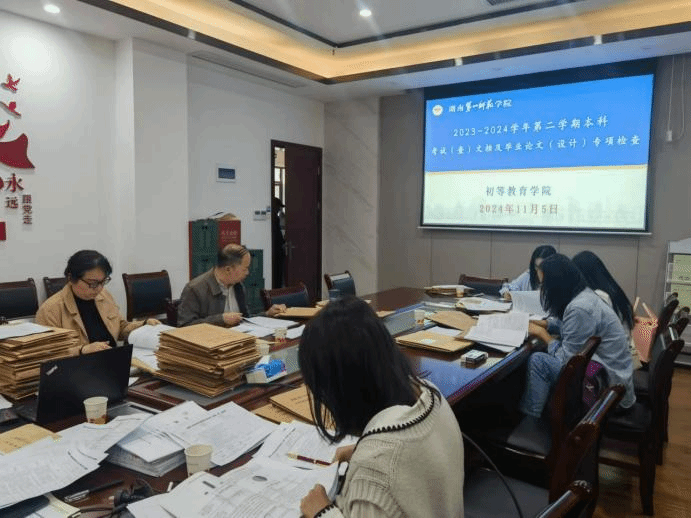 此次检查组以现场抽查的方式,随机调取2023-2024学年度第二学期开课的课程试卷及相关材料,2024届毕业论文(设计)相关材料及相关表格进行检查。检查专家按照《湖南第一师范学院本科课程考核工作评价表》和《湖南第一师范学院本科毕业论文评价表》的指标要求,对双向细目表、试卷、成绩分析报告、合理性评价表等课程考核文档和毕业论文相关材料进行了细致检查,并作了详细记录。检查组还对新进教师的教案、课件、作业布置等情况进行了检查。