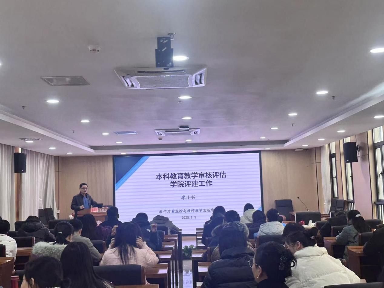 2025 年 1 月 3 日上午,我院召开本科教育教学高质量发展宣讲会。会议由院长曾晓洁主持,学校教学质量监控与教师教学发展中心主任廖小芒主讲。党委书记李宣平、副书记马青梅、副院长唐文杰以及全体教职工参加会议。
